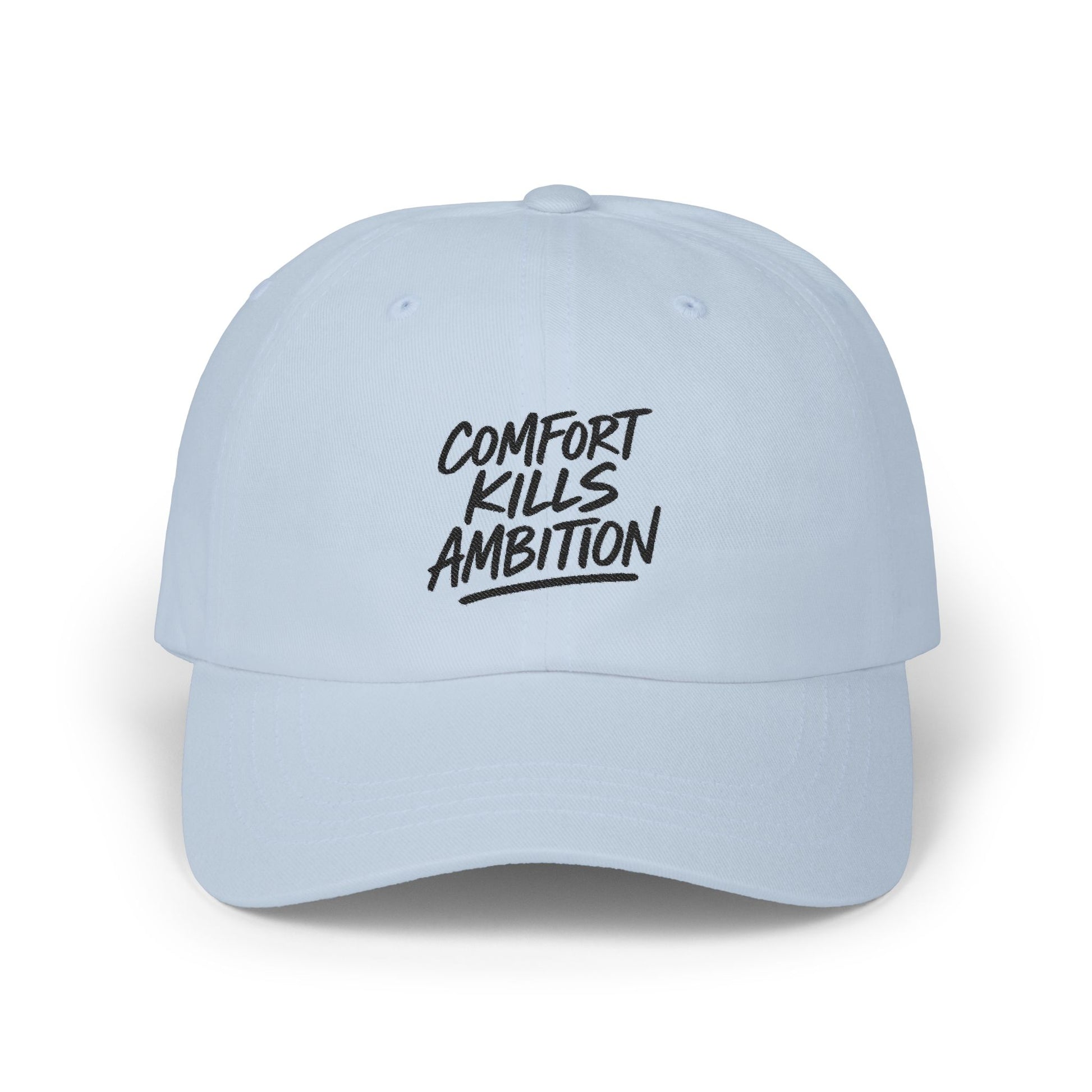 A clean, confident cap embroidered with a bold, handwritten: “Comfort Kills Ambition.” Lightweight and unstructured, it sits low on the forehead for a relaxed, lived-in look that still reads intentional. Wear it to push through early mornings, long runs, or creative grind sessions, it’s a small, wearable reminder to leave comfort behind and chase momentum.
